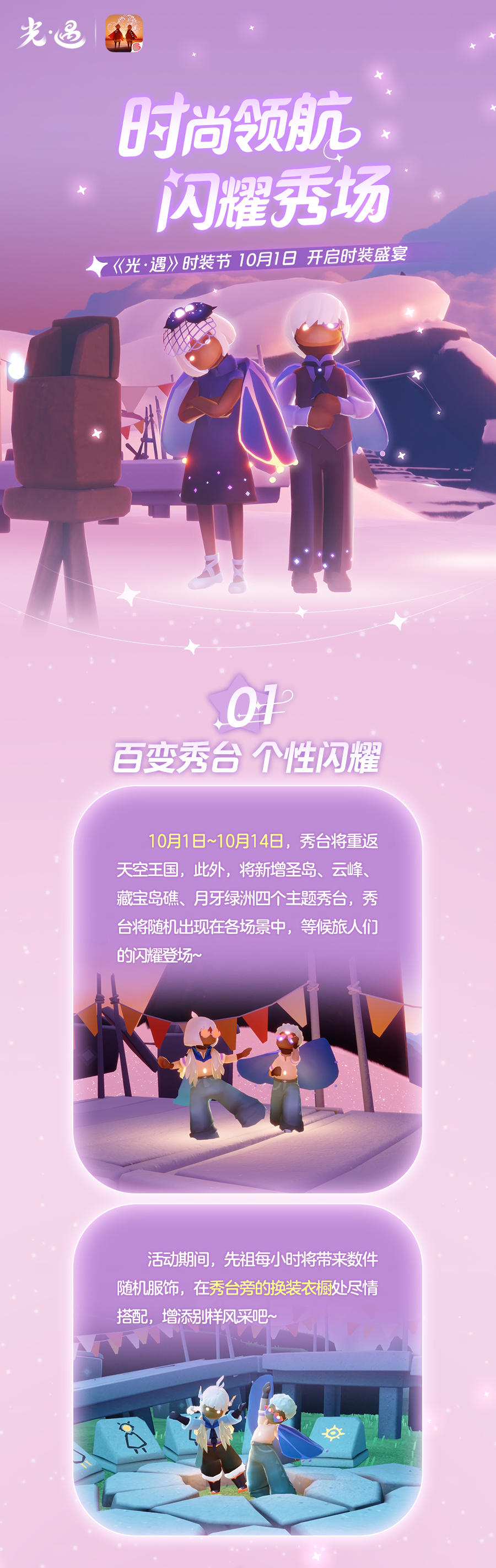 #光遇时装节# 精心搭配奔赴时装盛宴 镜头聚焦领航时尚风采 👒 《光·遇》时装节 将于10月1日正式开启 请旅人们仔细阅读更新公告,了解更多活动信息 ✨ 舞台亮起等候迎接夺目的身影 10月1日00:00~10月14日23:59 一同记录自己的闪耀时刻吧~ ------------------------------------- 👉点我一键开启云玩👈[cloudgaming://startgame?game_code=gy] 👉点我抽取时装节礼包👈[https://cloudgame.webapp.163.com/yw/?id=669e1a057e9655ee22289b9d]