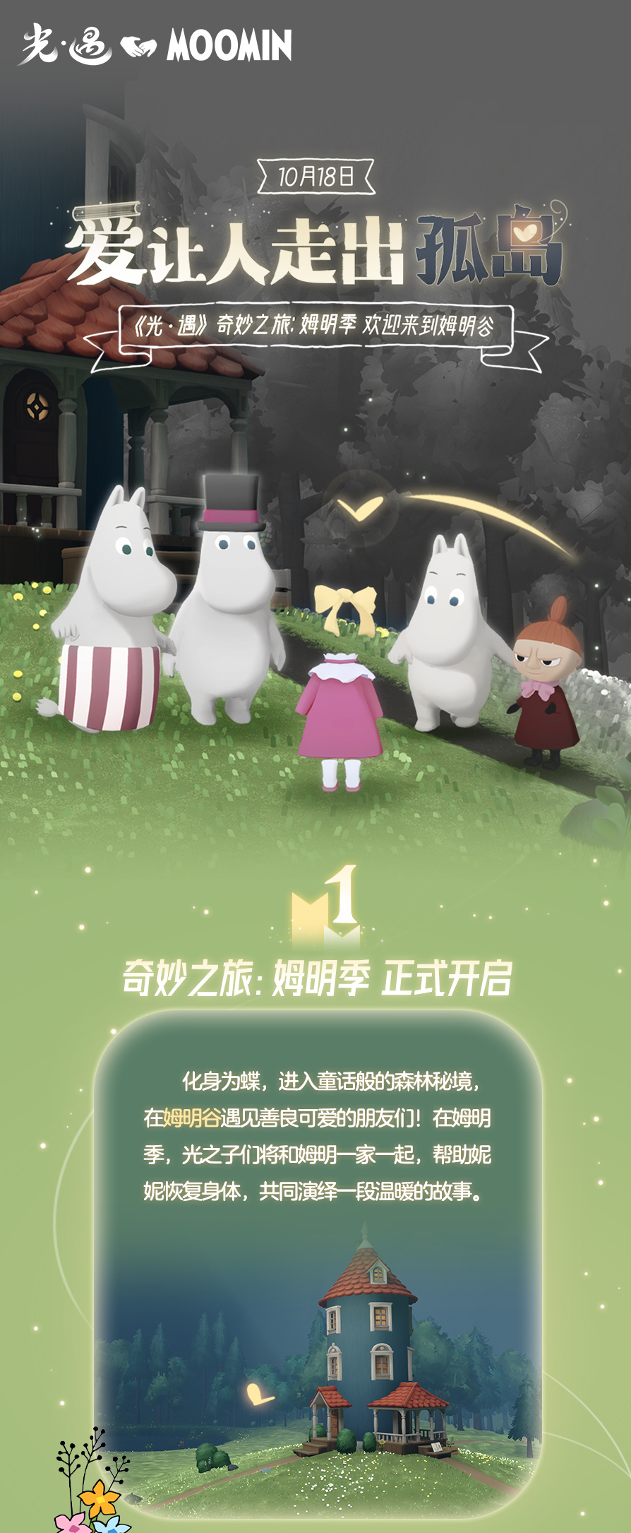 #光遇姆明季# 奔向山谷拥抱森林与溪流 光愈心灵让爱陪伴成长 📖 奇妙之旅:姆明季将于10月18日维护后正式开启 请旅人们仔细阅读更新公告,了解更多季节信息 ✨ 童话书正静候旅人前来阅读 10月18日 姆明谷见~ ------------------------------------- 👉点我一键开启云玩👈[cloudgaming://startgame?game_code=gy] 👉点我抽取时装节礼包👈[https://cloudgame.webapp.163.com/yw/?id=669e1a057e9655ee22289b9d]