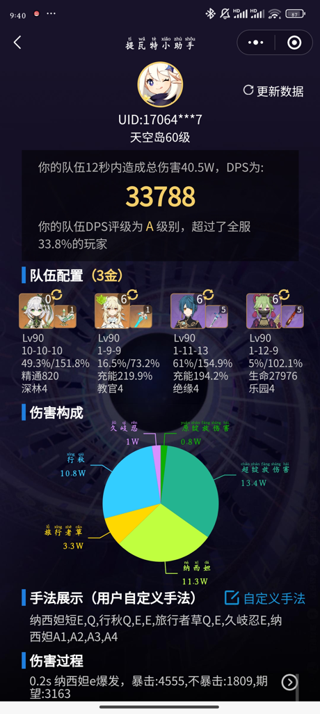 不过,当时我并没有练成双爆的草神,虽然高精通提升了我的暴击率,但爆伤却显得不足。整体来说,伤害表现中规中矩。那时我觉得草元素角色实在太多,而水元素角色则显得稀缺。