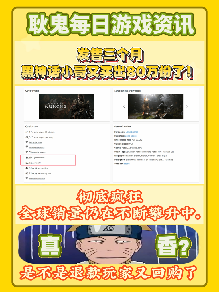 《黑神话:悟空》作为国内首款3A游戏,自发布以来已过去三个月,玩家热情依然高涨,Steam上的关注度持续不减。全球销量也在稳步增加,仅在短短一周内便售出超过80万份。