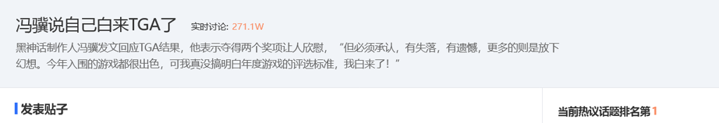黑神话的制作人冯骥在社交平台上对TGA的结果发表了自己的看法,