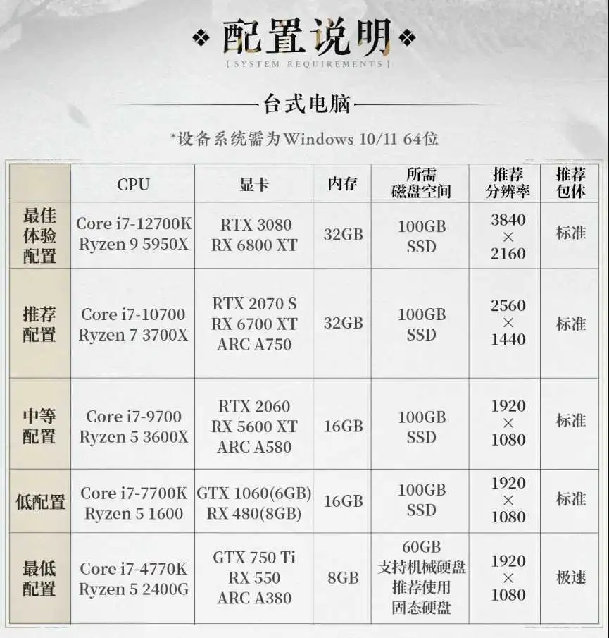 《燕云十六声》今日发布了PC版本的系统配置需求。