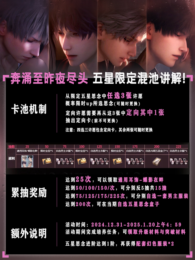 抽取达到75、125、175、225次时,每次可自选一套男主服装。