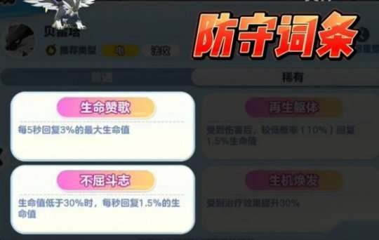 第一种侧重于防守,包含“生命赞歌”和“不屈斗志”两个词条,这些词条的主要功能是增强续航能力和提升伤害承受能力。