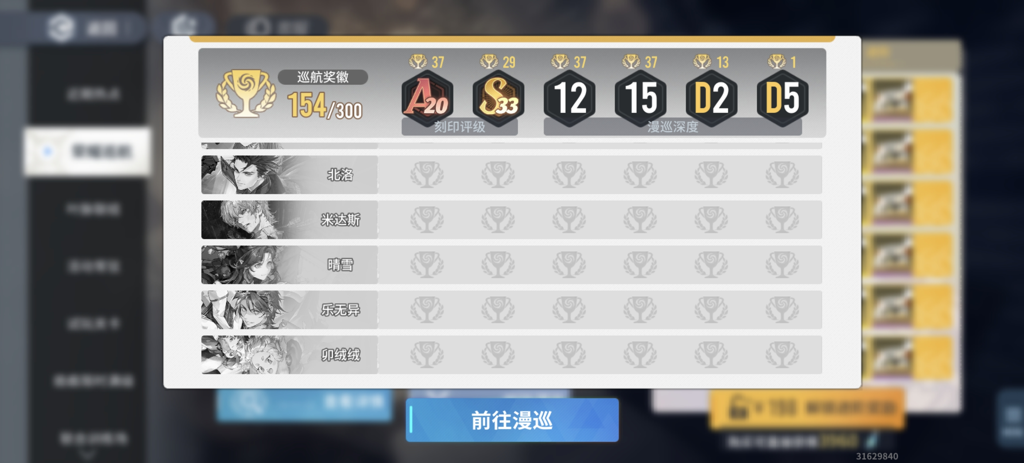 要完成所有奖励,玩家需要在白荆回廊中进行漫巡,具体要求是:进行50次d5,或者60次d2,或者75次深度15的漫巡。