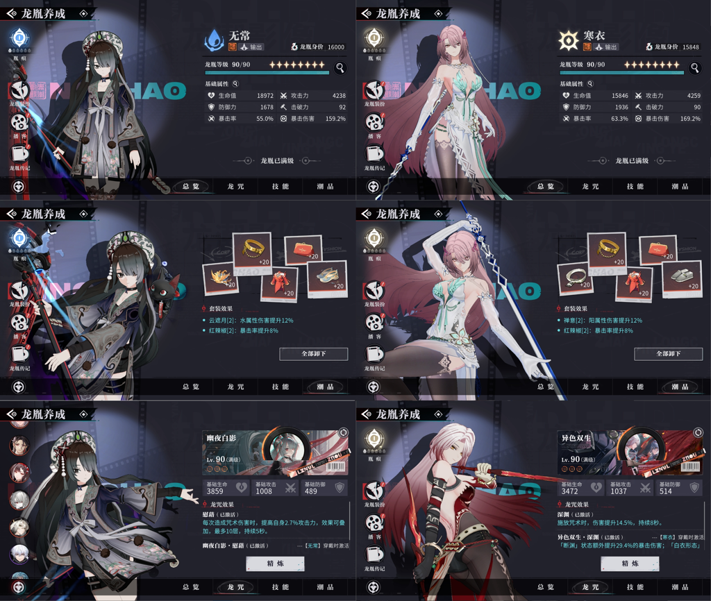 另外,我的无常和寒衣都是一命,装备和龙咒的数值相近。在挑战中,须臾在16层的分数大约在45万左右,而寒衣在17层的分数则可达到55万(这个数据仅供参考)。通过观察一些主播的表现,满命、装备齐全的情况下,他们在24层的表现也能为我们提供一些借鉴。