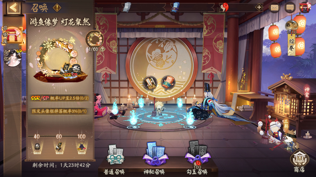 在活动期间,等级达到5级及以上的玩家,可以前往庭院右侧的召唤屋参与活动。在活动期间,使用神秘符咒、勾玉及现世符咒进行召唤的阴阳师们将迎来机会!SSR和SP式神的出现几率将提升至原有的2.5倍,每位阴阳师可享受两次机会。