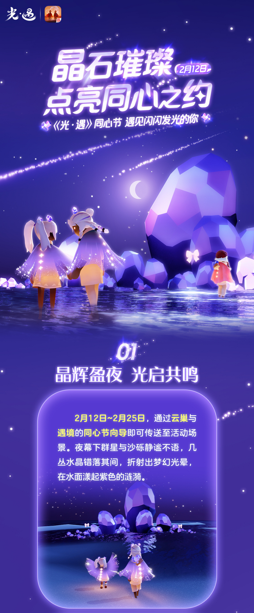 #光遇彩染季##光遇同心节# 晶芒闪烁中共赴友谊之约 流光倾泻处珍藏心动瞬间 🔮 《光·遇》同心节将于2月12日开启 请旅人们仔细阅读更新公告,了解更多活动信息 🌟 站在璀璨的水晶中仰望夜空 2月12日00:00~2月25日23:59 让晶辉与星芒见证闪闪发光的情谊吧~ ------------------------------------- 👉点我一键开启云玩👈[cloudgaming://startgame?game_code=gy] 👉点我抽取礼包👈[https://cloudgame.webapp.163.com/yw/?id=678a0f5653ae5ca3d52be1fc]