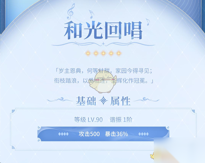 接下来,我们逐一分析这款武器和光回唱的具体属性,帮助玩家们更好地理解其在游戏中的应用与潜力。当「和光回唱」升至满级(90级)并处于谐振的第一阶段时,能够提供高达500的攻击力和30%的暴击率。这样的属性使得「和光回唱」非常适合那些追求高爆发输出的角色。