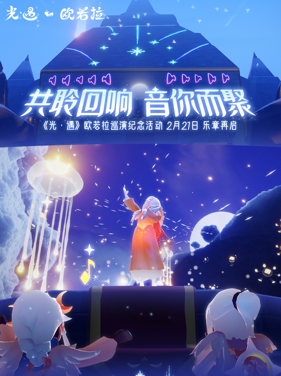 #光遇彩染季# 当音乐与星光交汇于舞台 将共鸣和感动再次谱写成歌 🎶 欧若拉巡演纪念活动将于2月21日开启 请旅人们仔细阅读更新公告,了解更多活动信息 🌟 让旋律点亮心中的温暖 2月21日00:00~3月6日23:59 共赴一场跨越次元的约定吧~
