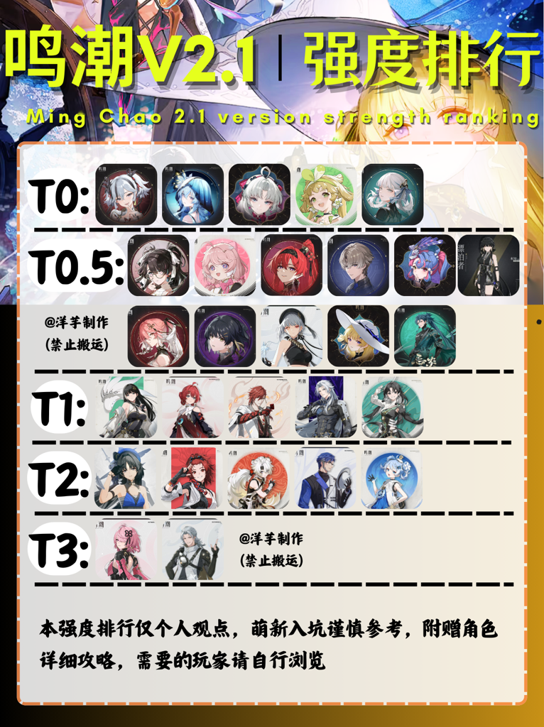 今天为大家带来全新的鸣潮角色强度排行榜!这只是我个人的看法,希望大家喜欢!
