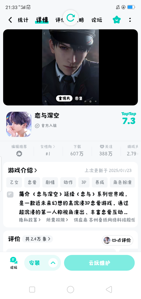 如果你的手机或者电脑内存不足以支持恋与深空的运行,如果你的手机游玩恋与深空会发烫,你可以选择使用网易云游戏来畅玩恋与深空。只需一键登录,即可随时上线游戏。网易云游戏同时支持手机(安卓和i0S 均已支持)、PC(网页&客户端,尽享模拟器般体验,支持 Mac&Windows 系统)、TV3 种游戏方式,无需下载即开即玩,非常方便。电脑&手机浏 览 器打开网 易 云 游 戏的官 网均可即享秒玩,i0s 用户也可以前往 App Store 下 载网易云游戏 APP,任意低配手机都能畅享 1080p60 帧顶级游戏画质,一键开始秒玩!非常方便,赶紧试试吧!