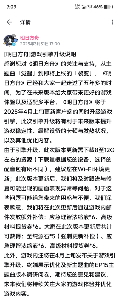 在更新完成后,我们会密切关注并修复可能出现的画面异常等问题。对于由此给您带来的困扰和不便,我们深表歉意。为感谢您的理解,我们将在游戏内通过邮件发放额外的补偿:应急理智浓缩液×6和高级材料提货券×6。