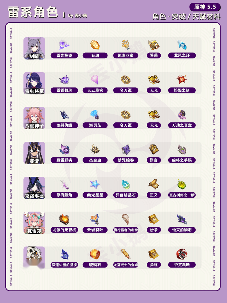 今天为大家准备了《原神5.5》版本的角色突破和天赋材料清单。