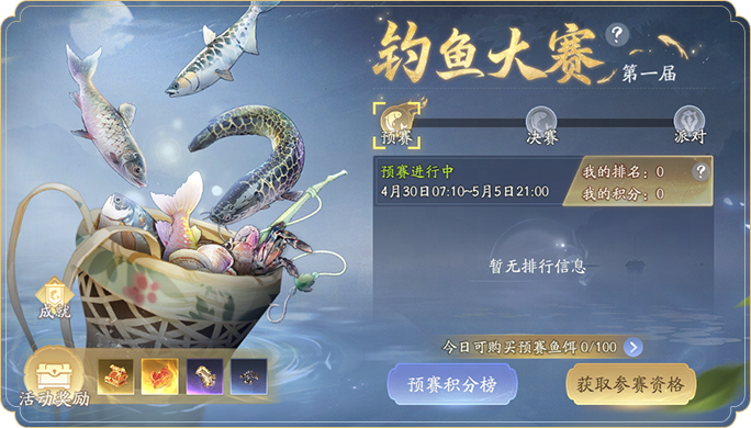 ● 预赛阶段从4月30日维护后开始,持续到5月5日21:00。在此期间,所有少侠可以提交一定数量的鱼类,以获得参加大赛的资格,并能领取到参赛奖励【荧惑晶】。获得资格的少侠每天可以在冯渔处购买限量的预赛专用鱼饵。玩家可以利用预赛鱼饵在各处进行钓鱼,捕获的鱼类和藏品将为他们积累预赛积分。随着钓术等级的提升,玩家钓到更大、更高品质鱼类的机会也会增加,从而获得更多的积分。在大赛期间,新的鱼种将在中都水域出现,玩家若能在指定钓点捕获这些鱼,将能获取额外的预赛积分。
