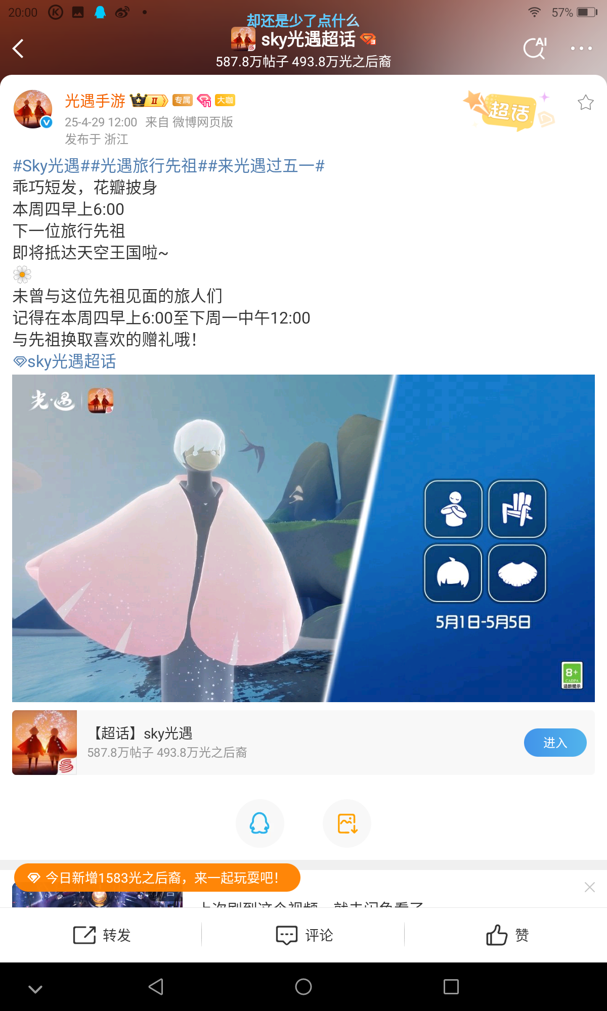 来更新了 本周四也就是明天复刻正太 兑换图和物品展示来自微博的 今天游离翻车了吗 由于图片不能超过10mb 所以动作就不展现出来了 #光遇青鸟季# #光遇复刻# #光遇帮帮团# #光遇最新爆料#