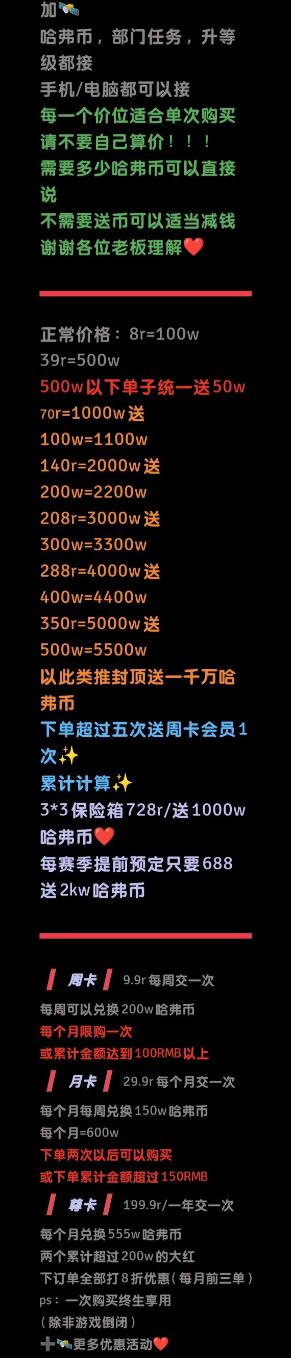 首单60r999w,可以走平台,纯绿手打跑刀/接3*3预定可优惠或送哈弗币(部门任务,燃料,锅都可以接) 可私信