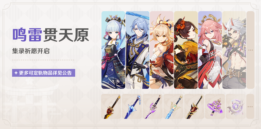 在活动期间,旅行者有机会从所有五星物品中,选择并确定一个五星角色或五星武器,这将提升在本期“鸣雷贯天原”祈愿中出现的概率。