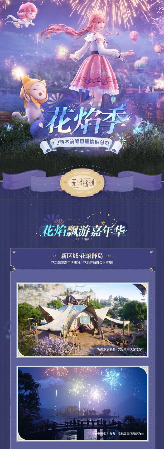 #无限暖暖#♾️ 《无限暖暖》1.2版本「花焰季」前瞻总结 本次直播中,项目组同学为大家带来了花焰季全新区域公开、主题活动前瞻、全新套装展示以及版本福利汇总等等超丰富的版本内容,量大管饱!ε=( o`ω′)ノ 为了各位搭配师能快速查看1.2版本信息,在这里为大家整理了直播内容汇总,点击下方长图,看看有哪些重点情报吧! *特别提示:直播中的兑换码将于2025-2-4 23:59:59 (UTC+8) 失效,搭配师们记得及时登录游戏兑换 全新版本「花焰季」1月24日正式开幕,让我们于花焰绽放之时,相聚在美好的奇迹大陆吧~! ----------------------- 👉点我一键云玩手游官服👈[cloudgaming://startgame?game_code=wxnnsy] 👉点我前往抽取648R游戏基金👈[https://cloudgame.webapp.163.com/pt/?id=650959321fc75bbbb837628d]