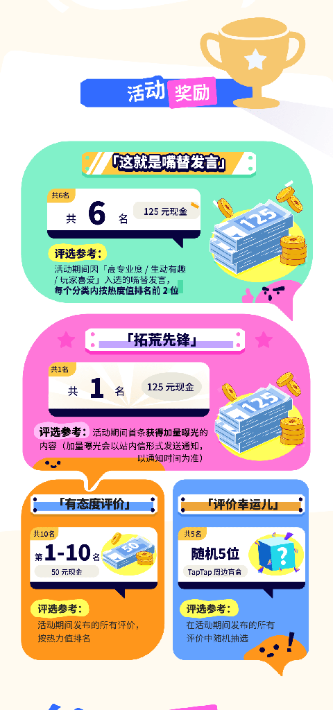在活动期间,第一条获得额外曝光的内容(加量曝光信息将通过站内信形式通知,具体以通知时间为准)将获得125元的现金奖励!快来参与,展现你的评测实力,一起推动游戏社区的繁荣!