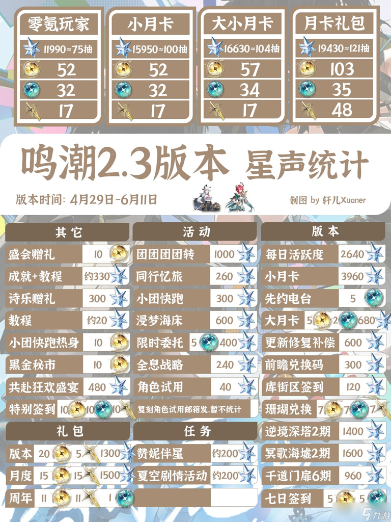 大小月卡玩家的资源更加丰富,月卡累计后大约可以完成104次抽取,获得16630星声,还包括57个金球、34个蓝球和17次铸涛波纹。