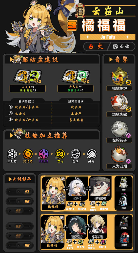关于音擎的选择,建议优先装备专属音擎【福虓炉炉】,因为它能显著提升30%的攻击力,有效减轻驱动盘攻击力的压力。同时,该音擎还能强化橘福福的关键招式,包括[强化特殊技]、[连携技]以及[终结技],增加失衡值和团队整体伤害输出。