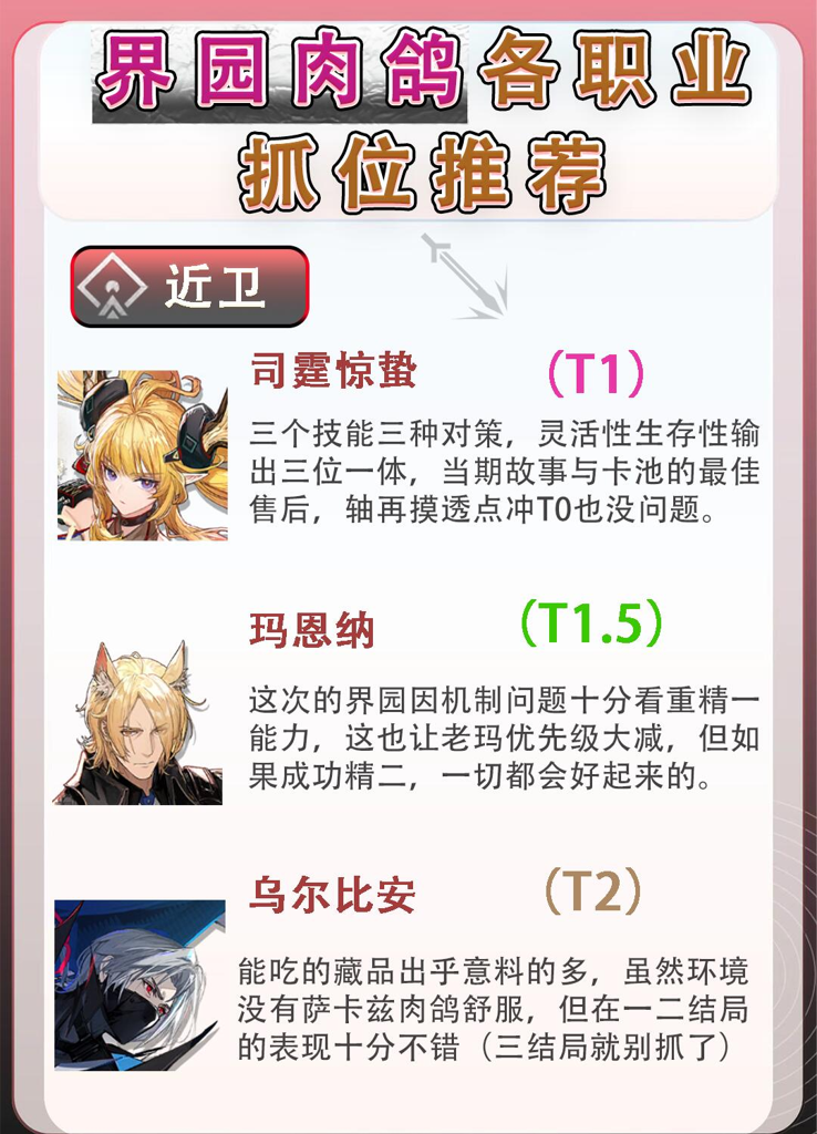 界园已经开放数日,许多操作熟练的玩家也开始挑战到N15关卡。整体来看,抓位策略与萨卡兹有所不同,因此我整理了一份适合高层玩家参考的职业抓位指南。
