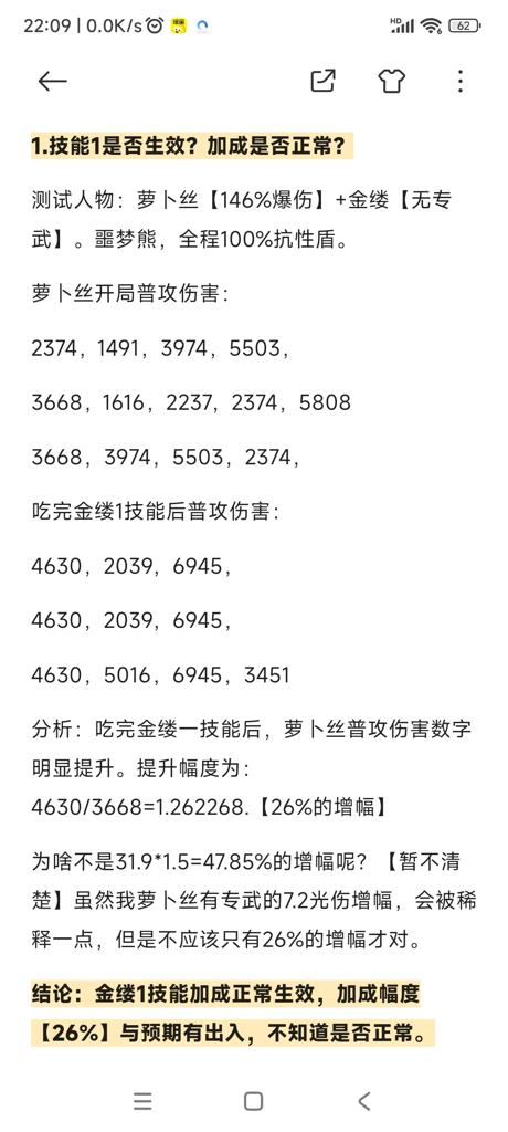 测试主要关注金缕技能的效果,特别是技能1是否成功触发以及加成是否符合预期。
