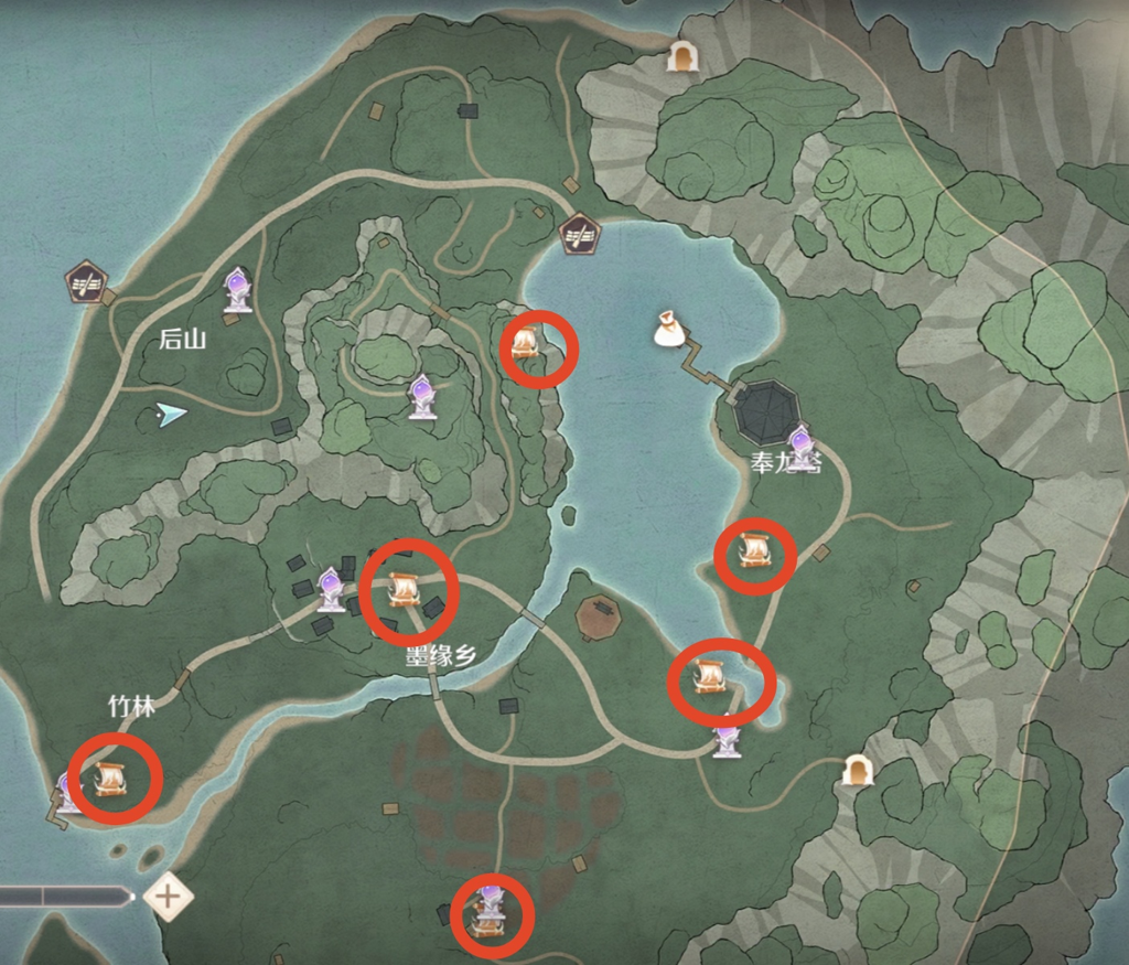 在游戏中,红色的圈圈标记出奇境画轴的关键位置