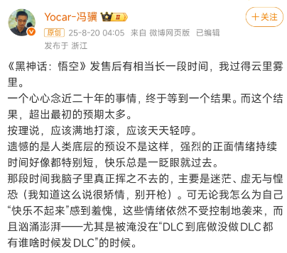 著名游戏制作人冯骥老师随后在社交平台发布了一篇长文,回应了玩家们关于DLC的疑问——“DLC到底有没有?有哪些内容?何时推出?”他坦言,自己曾在这个方向上努力尝试过,但最终经过深思熟虑后,与合作伙伴杨奇的交流使他坚定了继续开发新作品的决心。如今,他已明确表示将专注于打造全新的游戏项目,为玩家带来不同的精彩体验。