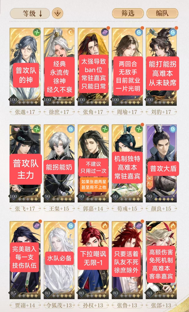在50到70级之间的角色,如庞统、戏学、鲁肃、黄盖以及张辽,也能发挥一定作用,尤其是在资源有限时。