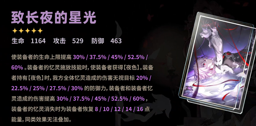 该光锥的基础生命值较高,为长夜月提供30%的生命值上限提升,有效增强其生存能力。