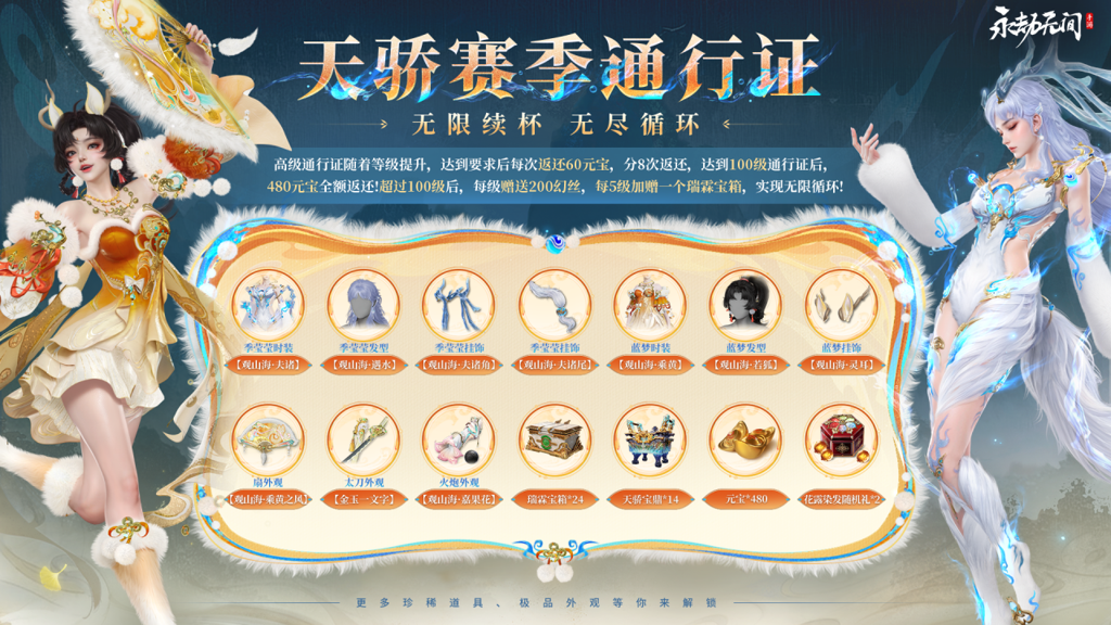 新赛季的通行证内容并没有详细说明,只是放出了相关图片。不得不说,图片中的服装让我一时间难以辨认,原本以为是沈妙的装扮,结果却是蓝梦和季莹莹。