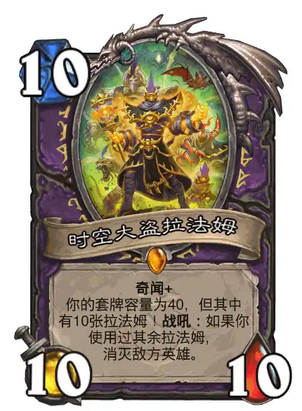 在今日凌晨推出的新卡中,出现了一位令人瞩目的强力角色——时空大盗拉法姆。这张卡牌的基础属性是10费,拥有10点攻击和10点生命值,极具威胁性。