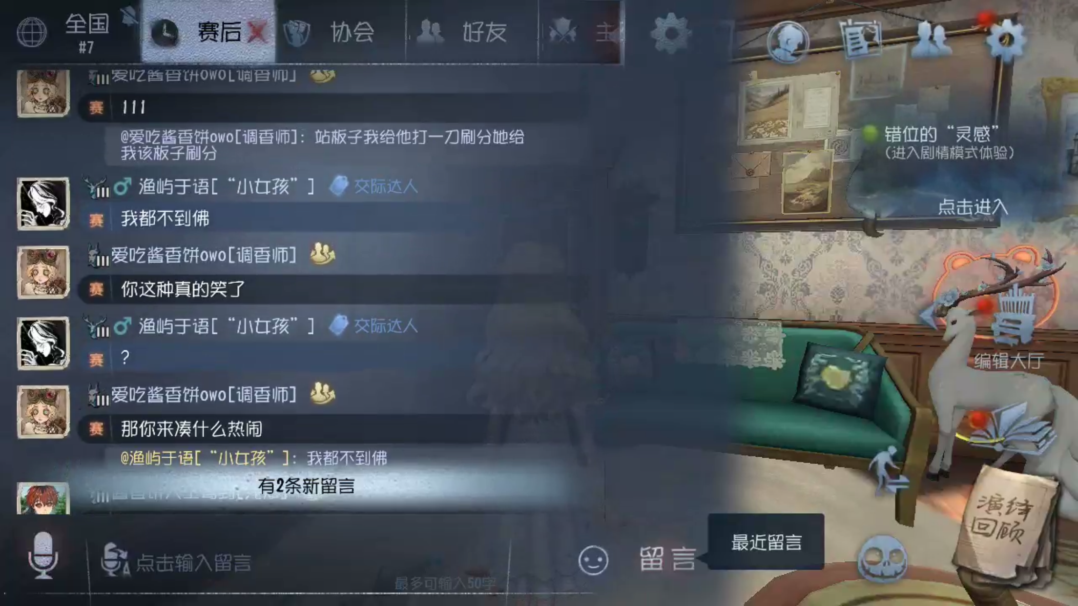 #第五人格##避雷#?气死我了。我还什么也没说他们就在那破防,(事情是我单排,先知调香双排遇到了疑似佛系的监管,但监管没明确转圈,人家站在班子边上然后被先知砸了,先知故意的,but监管没让他砸,他还一个劲砸,欺佛哈,)赛后小说家问怎么砸那么多板的,我说是佛,然后小说说完先知调香欺佛就退了,然后2🐷就开始了嘉豪发言,说我也砸板子了的。?不是㊗️吗?一开始我都不到佛系好吧,然后我看到调香破香被打我以为不是佛就传过去帮他(当时还有2台机)看监管和调香在博弈我就帮调香砸板,我就只砸了一次,他们俩登加在一起快6次多,我什么也没说。反倒被他们说。好的第五是越来越玩不下去了,我要改玩鸣潮呵呵(避雷)