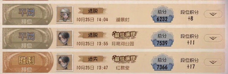 虽然但是我还是想说红蝶和蛐蛐这次的皮肤特别权威。。但是我才1万紫薯要留着买记者新紫皮。但是我看了一下今年下半年好多排期都是我很喜欢的角色怎么办?。。而且没钱给游戏充钱。我也没设备啊。。 今天排位手感特别好。连赢三把。 第一把记者被抢了。我溜。16秒倒了。压满就之后二六六到队友开门走了。👁️💪🏻💪🏻💪🏻 第二把囚徒直接睡着了。。然后刚好被监管看到连打两刀。开局刷椅子上了。又是我66到最后两台共差60-70%然后空军在我旁边补机然后换抓了。 第三把入殓被抢了。补位。无大风大浪。只是佣兵带全队唯一搏命秒倒渔女地下室了。卖了。然后气象6挺好。但入殓和气象疑似没有争的想法。然后我就遗憾离场。 。。最近好多禁记者的了。开始干老本行了。萌。
