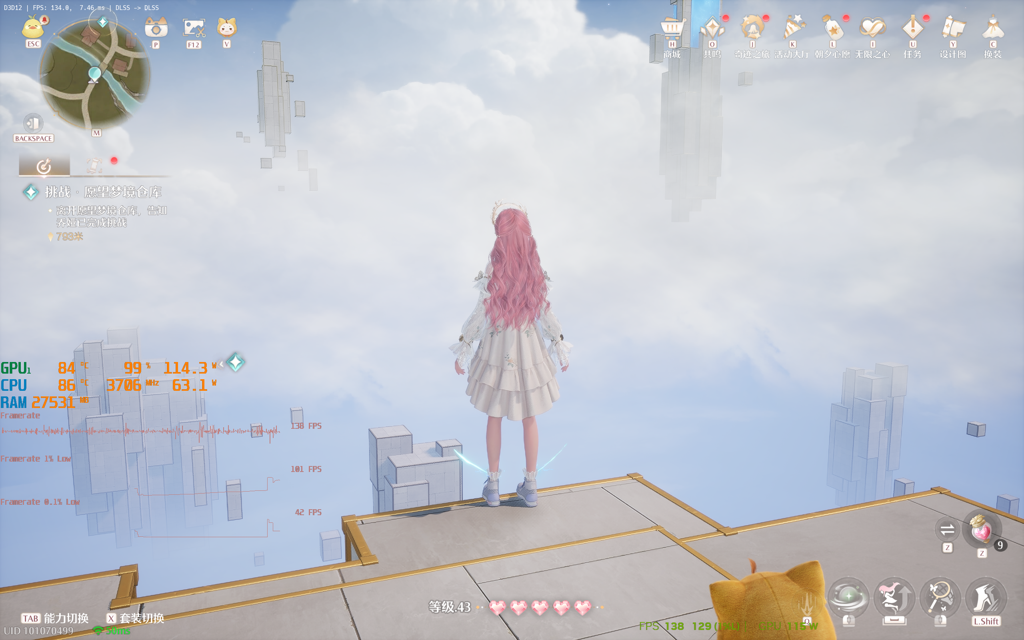 在某些小关卡中,游戏的帧率可以达到约138,尤其是在天空场景时,表现尤为出色。