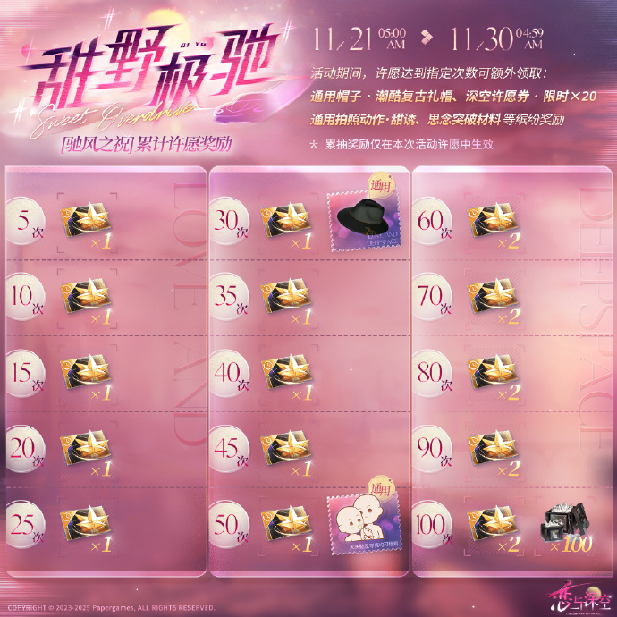 在活动期间,只要累计许愿达到特定次数,就能获得丰富的奖励,包括炫酷的通用帽子「潮流复古礼帽」和限时使用的「深空许愿券·20张」!此外,还可以解锁专属拍照动作「甜蜜诱惑」以及珍贵的思念突破材料,帮助你快速提升实力。