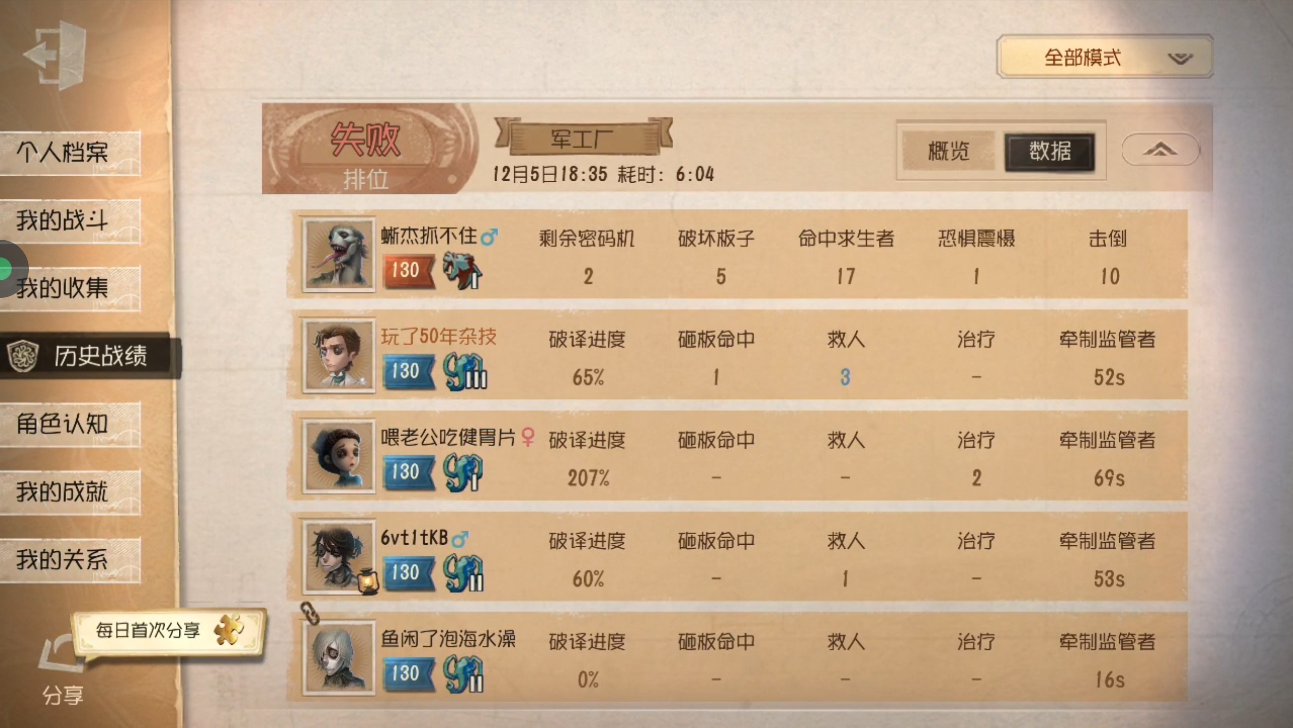 打排位给面色打红润了,两次牵制都交不出道具的守墓人,带着两个铲子飞天下一把四个铲子,还有这个知道地下室在哪里还往那死的的囚徒,原本在局内还有几分困惑,以至于是愤怒的地步,赛后看一下胜率,这把确实该我输的😊
