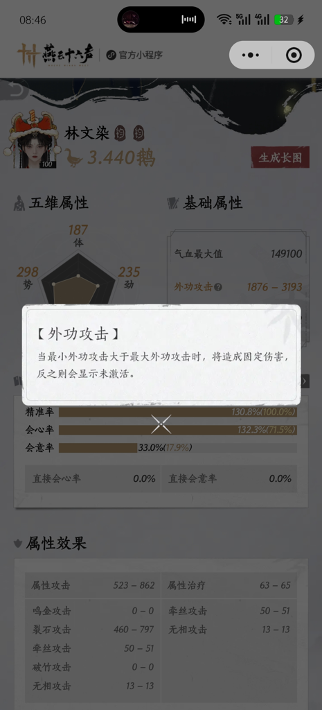 实际上,游戏中的伤害机制决定了当小外大于大外,伤害会在会意触发时按小外的数值进行计算。这意味着,小外的优势在于它对伤害的贡献是大外的两倍——实现了“双倍转换”的效果。在不考虑会意的情况下,如果仅用3000的小外属性,所带来的伤害期望值等同于同时拥有3000小外和3000大外的总和,或是用2000小外结合4000大外得到的伤害。由此可见,将小外优先堆叠,不仅可以最大化会意时的伤害收益,还能在整体属性配置中实现更高的效率。