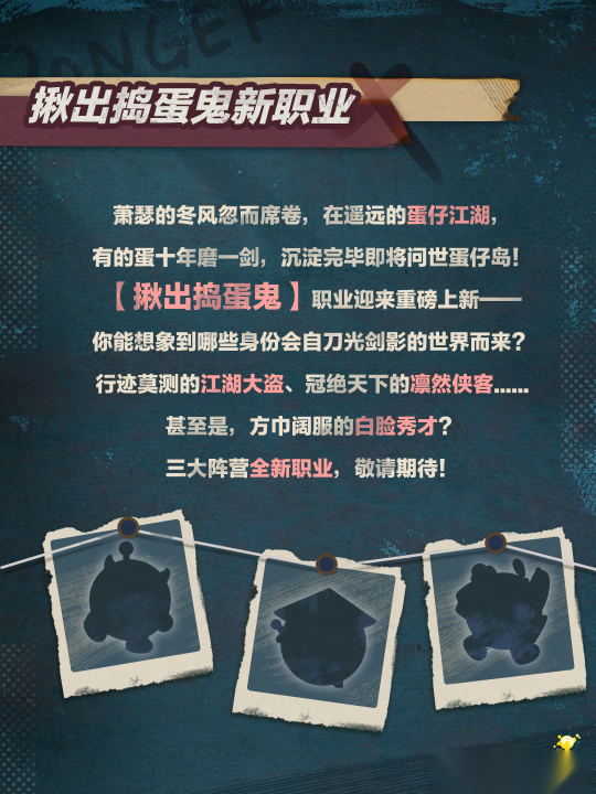 🎋此次【揪出捣蛋鬼】职业将推出重磅更新——你能想到哪些角色会在这个刀光剑影的世界中登场?或许是神秘莫测的江湖盗贼,或者是无畏无惧的英勇侠客……甚至可能是身着华丽长袍的文人雅士!🎉 新的游戏模式即将震撼推出!当夜幕降临时,务必小心那些科学怪咖,他们将化身为变异蛋,悄悄潜伏在你的身后!