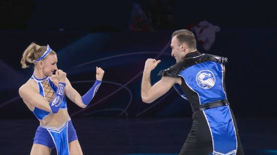 得益于舞台表演的高度自由,梅特尔基娜和贝鲁拉瓦选择将《真人快打》作为演出的主线。为了增强现场氛围,他们特别采用了电影中广为人知的配乐《techno syndrome》,让观众仿佛置身于经典格斗场景中。整场表演充满创意,开场两人站在冰场边缘,模拟日常交流。梅特尔基娜建议去欣赏花样滑冰,而贝鲁拉瓦则更倾向于玩电子游戏,还提议教搭档一招一式。紧接着,两人身着《真人快打》中吉塔娜和绝对零度的经典角色造型,正式拉开了精彩的冰上秀幕。