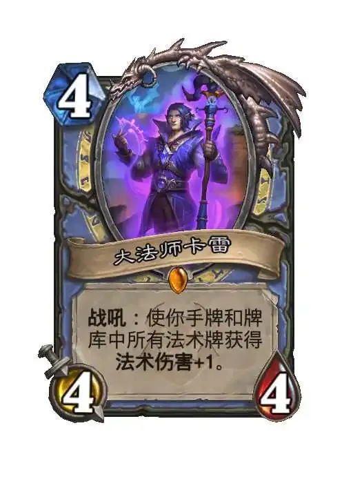 卡雷大法师是一位强力的法术增强者,初登场时以4费召唤,拥有4/4的身材。