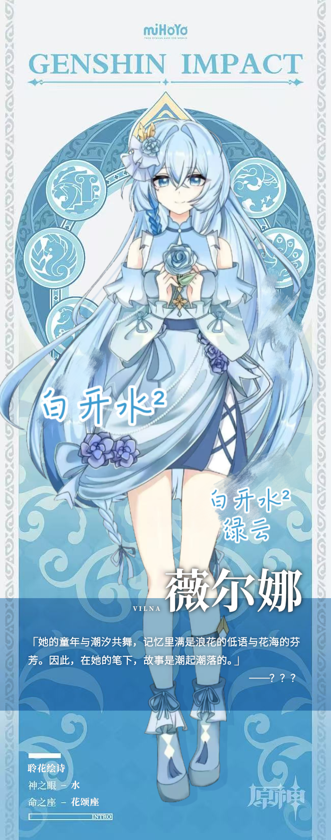#同人创作#瑰依落园,潮落吟歌 ▌「聆花绘诗」· 薇尔娜 ========== 「 她的童年与潮汐共舞,记忆里满是浪花的低语与花海的芬芳。因此,在她的笔下,故事是潮起潮落的。」——————??? 父亲是追寻失落史诗的蒙德学者,教她聆听浪花的诗句;母亲是蒙德的吟游诗人,牵着她的手辨认花海的私语。 17 岁时父母相继病逝离世后,她带着一本残破的古诗集,只身前往须弥求索。她寻找的不是语法,而是潮汐与花海共鸣的韵律。对她而言,生命就是一场从浪花到花海的旅行,她是一粒被潮水带上陆地的种子,在异乡的土地里,唱着关于归途的歌。 Γ浪花是大海的诗行,而花海是陆地的诗篇。我所做的,只是在两片诗海之间,寻觅失落的韵脚。」 她的研究不再仅仅是考据,而是一种“翻译”。她相信,每一朵花的绽放与每一阵浪的起伏,都遵循着某种古老的韵律。她试图将潮水冲刷沙滩的节奏,与特定花种在风中摇曳的姿态对应起来,认为这二者是同一首创世诗篇的不同变调。 「我将远方的潮汐,藏进每一首献给花海的诗里。」