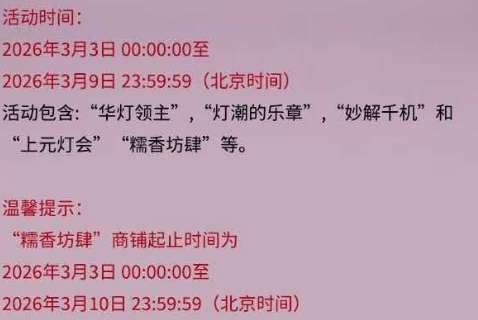 在2026年3月3日至3月9日之间,将举行一次精彩纷呈的元宵节庆祝活动。此次活动主题为【妙解千机】,为玩家带来丰富多彩的互动体验和趣味挑战。届时,大家可以参与各种灯谜竞猜、传统表演以及特色美食,感受浓厚的节日氛围。快来一起迎接节日的到来,揭开【妙解千机】的神秘面纱!