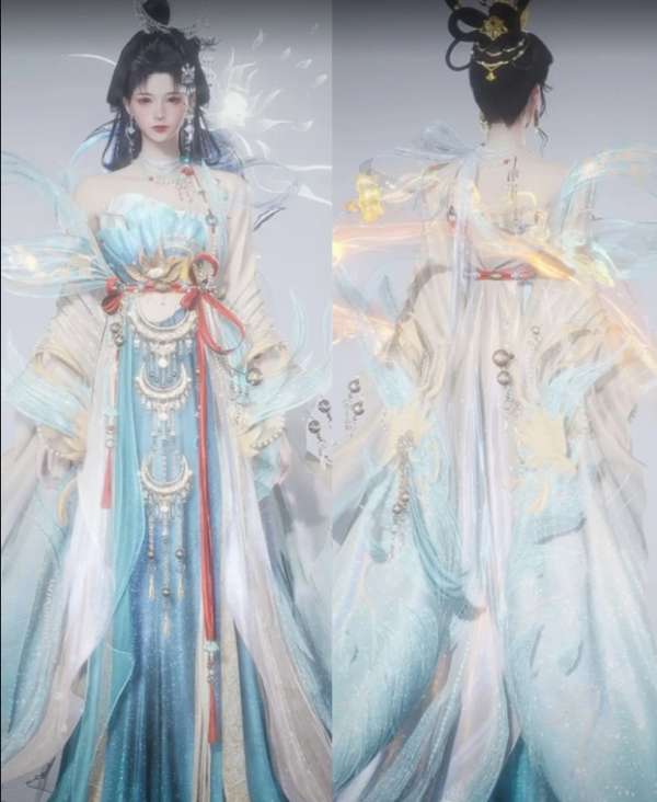 染色效果提升了整体的细节表现,飘带、金饰在动态光影中更加璀璨夺目,行走间流光溢彩,胜似仙人下凡。
