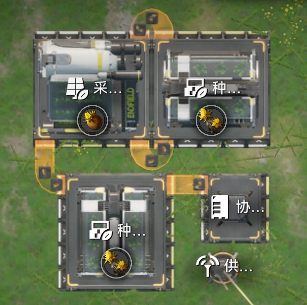 通过巧妙利用资源采集站的“多功能”特性,可以实现高效的生产与存储管理。例如,将一台采种机设置为“多次采集”模式,配合两个不同的布局方案。