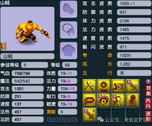 这位山贼的表现堪称卓越,无论资质、成长还是技能都展现出极强的实力,完美诠释了山贼的形象。首先,他的攻击资质高达1551,成长值为1.282,凭借这些基础数据,79级时未装备任何武器就能输出1301的攻击力。技能方面,他的配置更是令人惊叹,不仅掌握了善恶有报这样的强力输出技能,还配备了多项增强属性的技能,如高必、高进必、高偷、高夜和高遗志。搭配一件强力的装备后,整体输出能力飙升,堪称顶尖水平。除了攻击外,他的法术防御也表现不俗,排名第二,仅次于三条防御型技能,为整体战斗提供了坚实的保障。