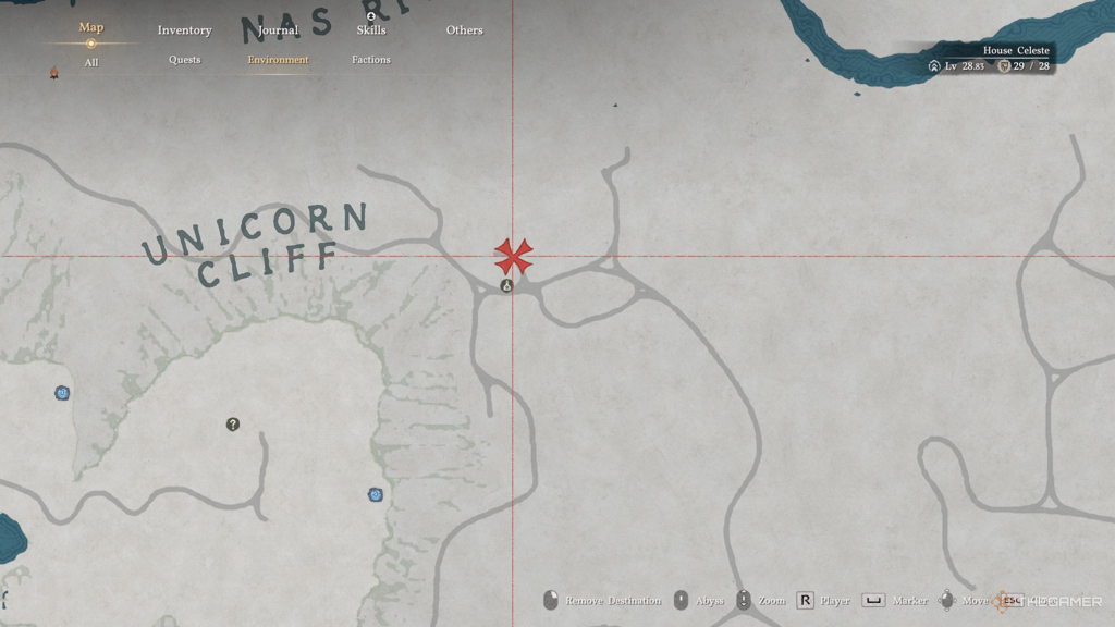 完成《红色沙漠》的序章后,你会在赫南德的主要城市中重生。打开地图,发现一条蜿蜒的河流从城市向南流去。沿着这条河一直走,直到越过河岸,再向东前行。经过一段旅程后,你会抵达一个名为“独角兽悬崖”的地区。